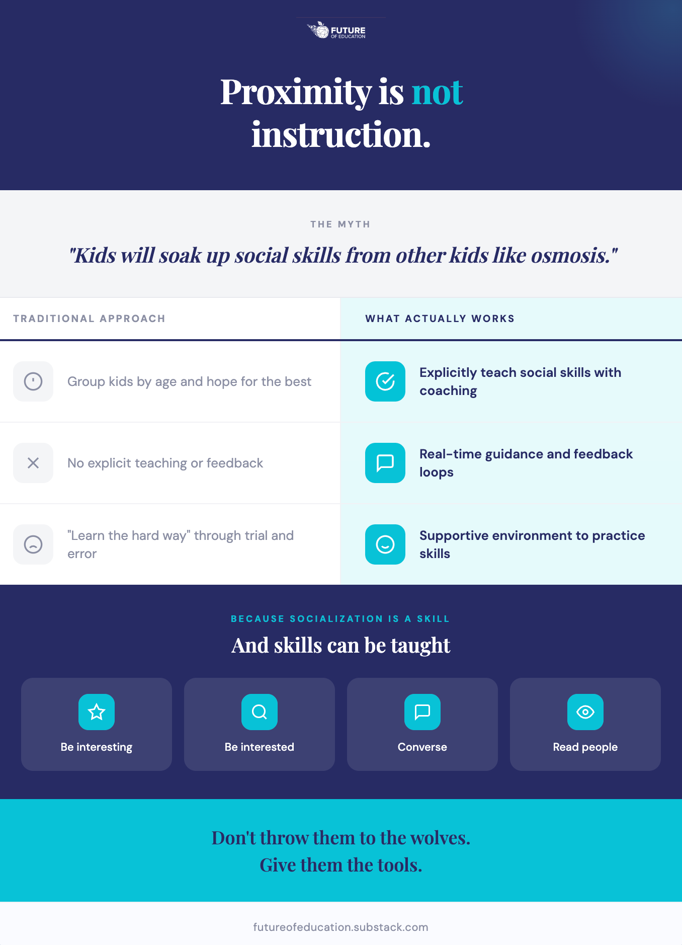There is no explicit socialization teaching, coaching, or feedback in traditional schools. They simply group kids by age, seat them in rows, and then expect them to navigate incredibly complex dynamics on their own.