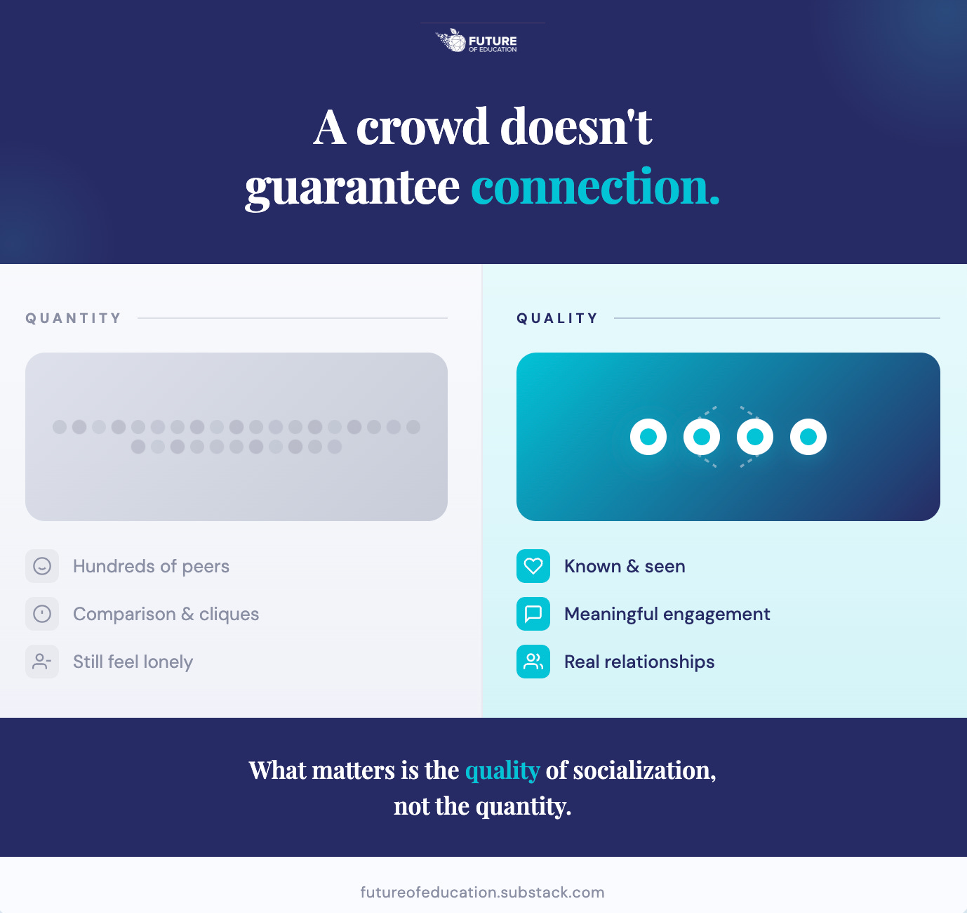 But real socialization has nothing to do with how many peers your kid passes in the hallway. Does your kid know how to connect with others? Communicate clearly? Read social cues? Build meaningful relationships? Navigate awkward conversations?