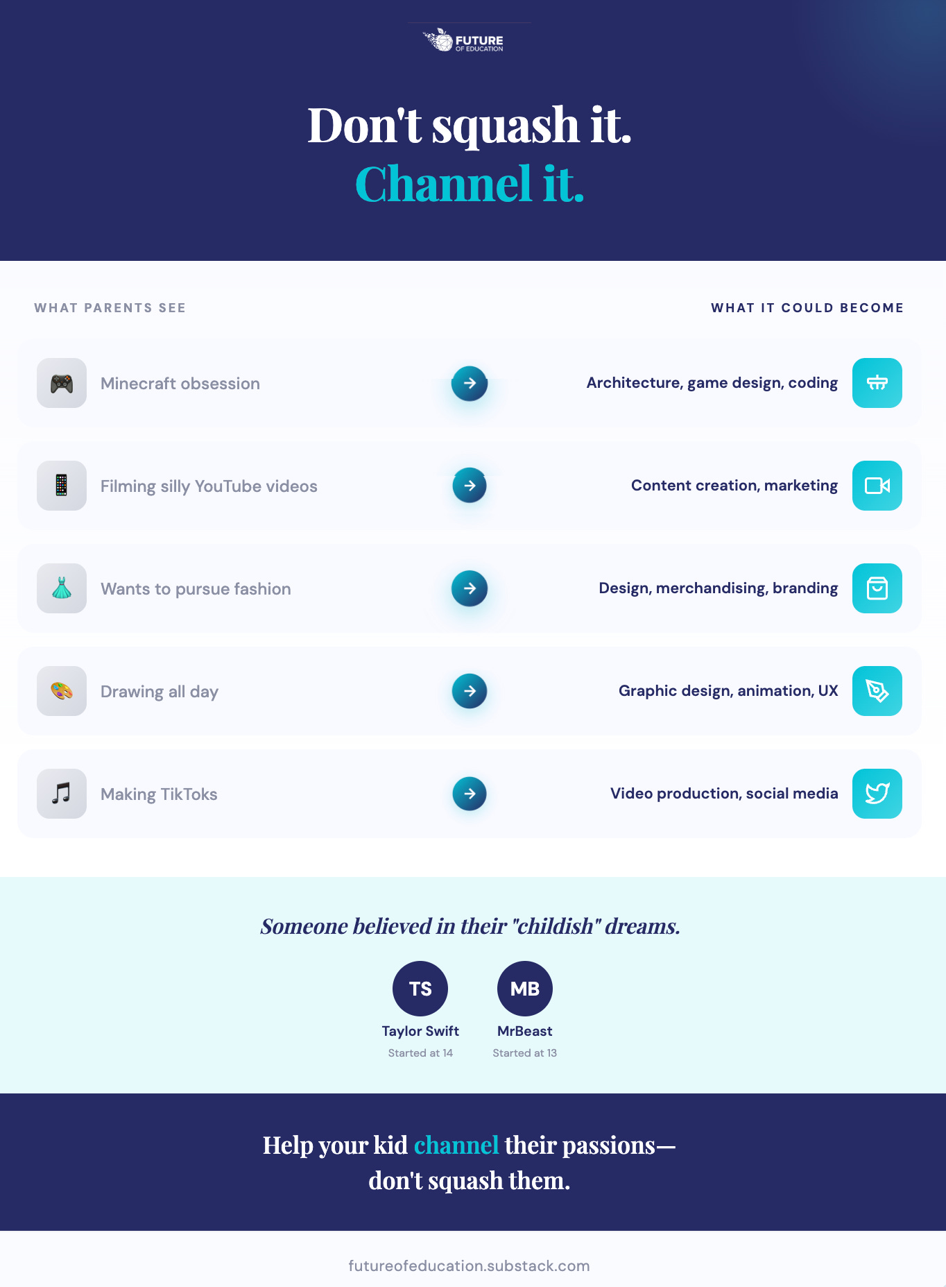 The truth is that kids learn best when they’re allowed to go down paths they’re genuinely excited about. Don’t make your kid become a doctor if they want to be an opera singer. Or an entrepreneur. Or a designer. Or something you’ve never even heard of yet.