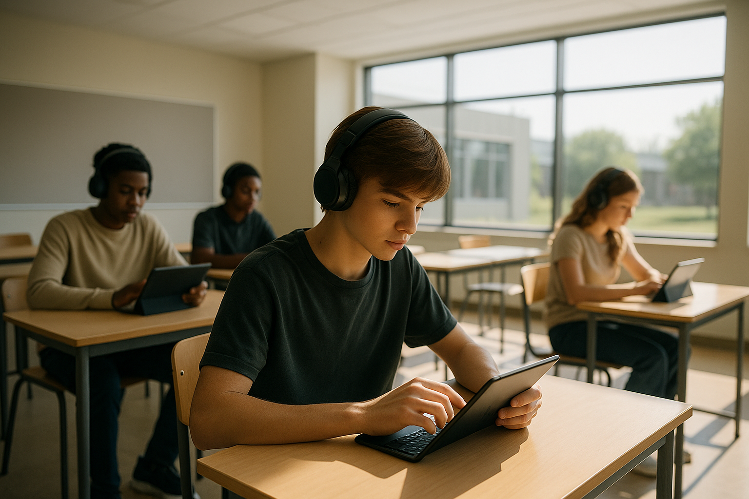 It’s 10:45 a.m. in Austin, and the classroom looks nothing like the one most parents remember. Students wearing headphones work independently through math and reading challenges at their own pace while a guide checks progress dashboards. By lunchtime, their academic day is done.