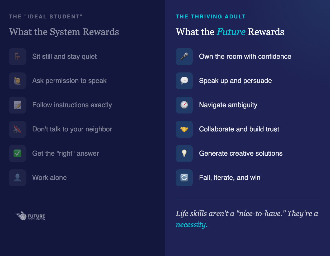 Meanwhile, the skills that actually determine success, like public speaking, negotiation, resilience, and leadership, get shoved into an optional elective. Or ignored entirely.